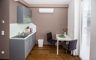 Studio se sastoji od prostrane dnevne sobe – u okviru koje je moderna, u potpunosti opremljena kuhinja i prostranog kupatila. Apartman je predviđen za smeštaj maksimalno dve odrasle osobe. Studio poseduje i mali balkon sa balkonskim nameštajem koji je dvorišno orijentisan.